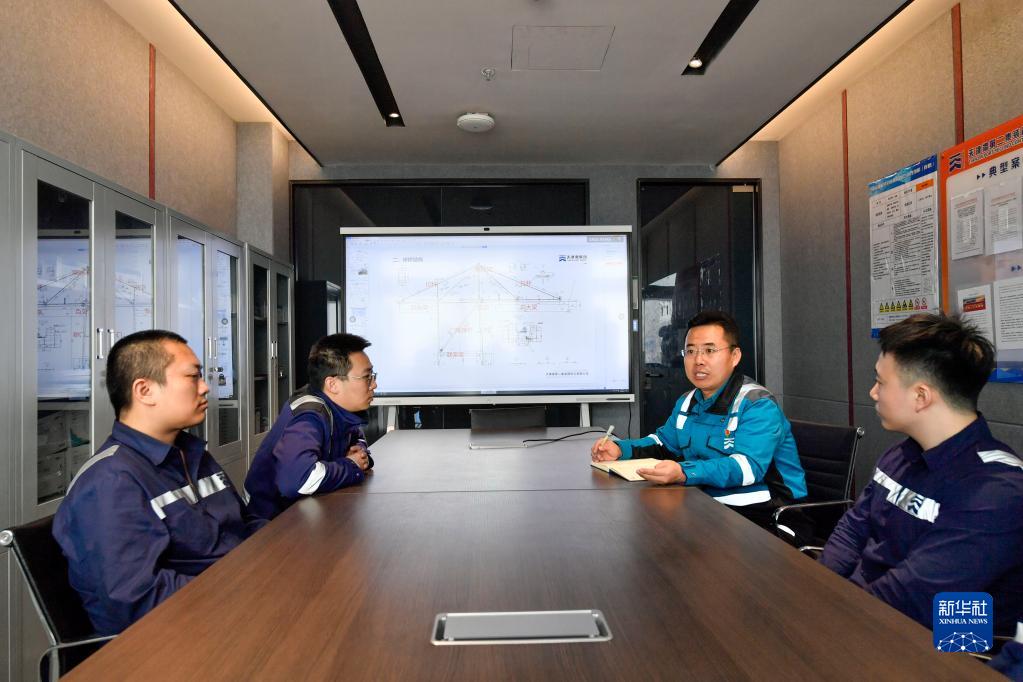 在天津港全物聯(lián)網(wǎng)集裝箱碼頭一會(huì )議室,成衛東(右二)在午休時(shí)間向年輕職工了解情況(2月17日攝)。