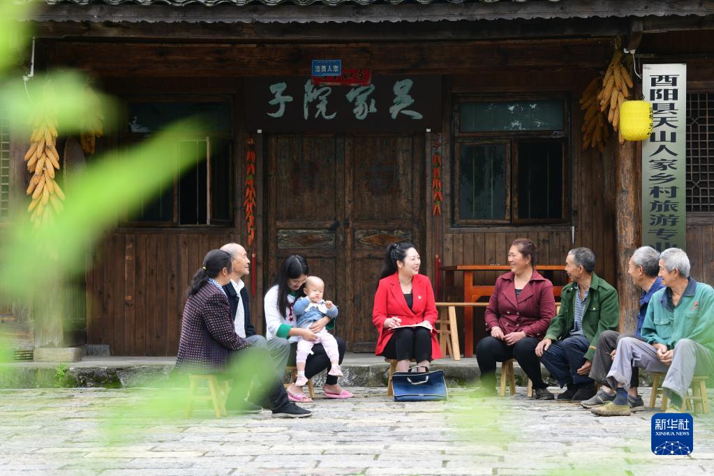 全國人大代表、重慶酉陽(yáng)土家族苗族自治縣桃花源街道天山堡村黨支部書(shū)記、村委會(huì )主任冉慧(右五)在調研鄉村旅游發(fā)展情況(2020年5月15日攝)。