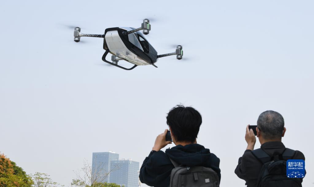 在廣州市番禺區小鵬匯天總部,參觀(guān)者觀(guān)看飛行汽車(chē)旅航者X2飛行演示(2月24日攝)。