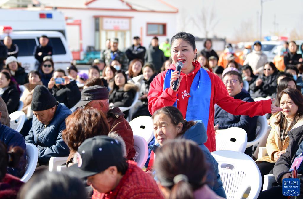 3月3日,在二連浩特市格日勒敖都蘇木賽烏素嘎查文化廣場(chǎng),文藝志愿者為群眾演唱歌曲《陽(yáng)光中國》。