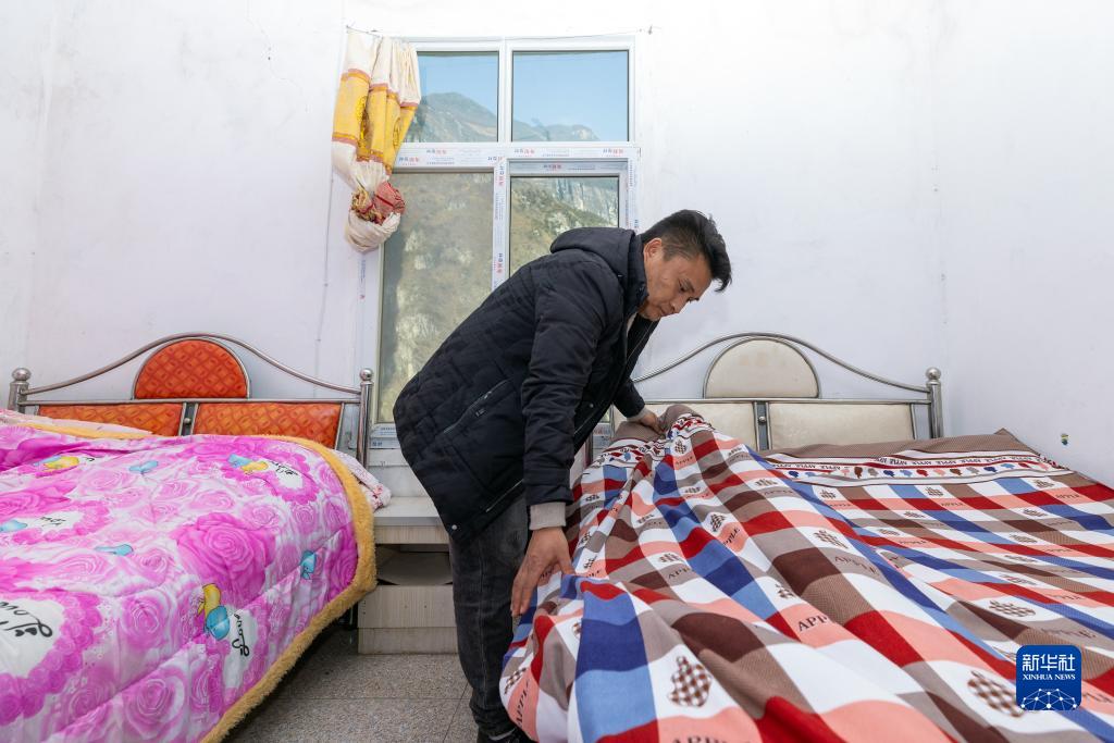 2月14日,鄭望春在自家開(kāi)辦的農家樂(lè )“懸崖人家”的懸崖景觀(guān)房里整理床鋪。