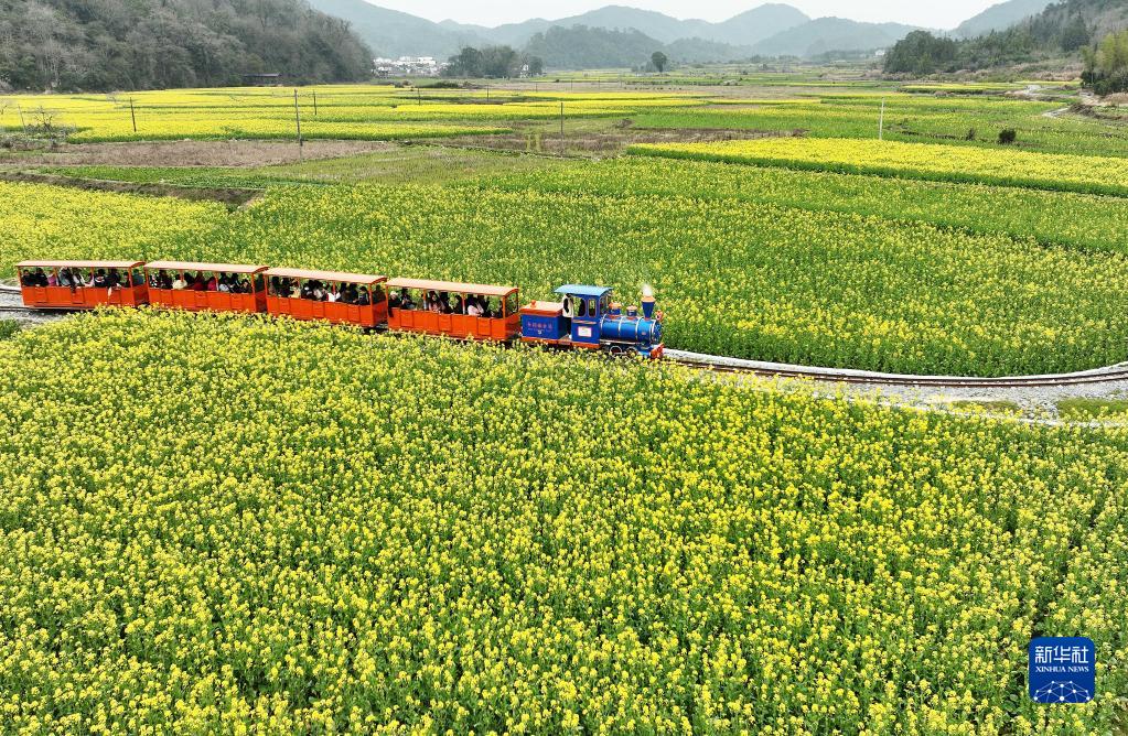 游客在江西省婺源縣嚴田景區乘坐“小火車(chē)”觀(guān)賞花海(3月3日攝,無(wú)人機照片)。