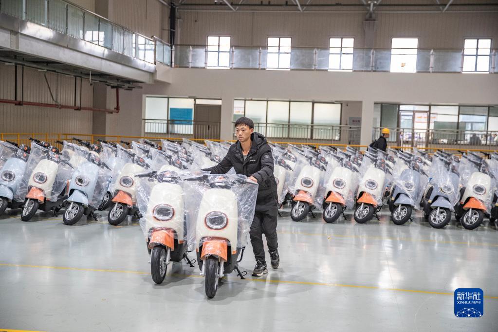 2月22日,在雅迪科技集團重慶永川電動(dòng)車(chē)生產(chǎn)基地,員工將成品電動(dòng)車(chē)推至智能化運輸線(xiàn)上運往倉庫。