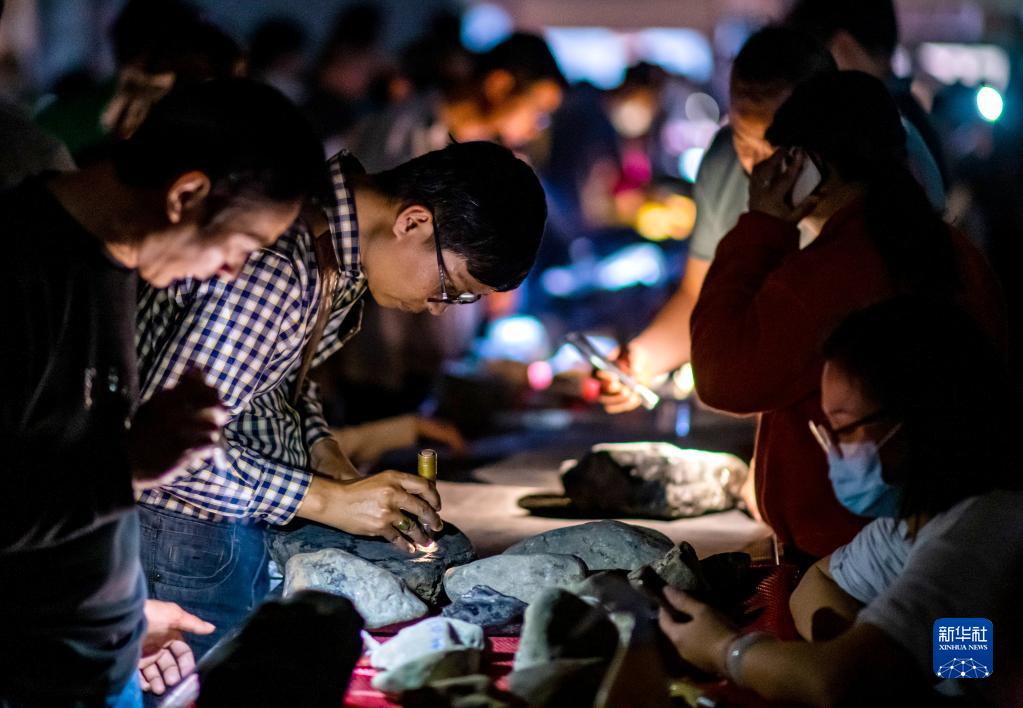 客商在云南省瑞麗市一處夜間珠寶銷(xiāo)售市場(chǎng)挑選翡翠原石(3月3日攝)。