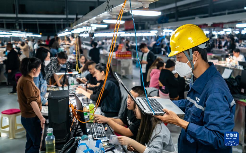 中國移動(dòng)公司的一名工作人員(右一)在云南省瑞麗市一處珠寶直播市場(chǎng)進(jìn)行網(wǎng)絡(luò )設備維護(3月3日攝)。