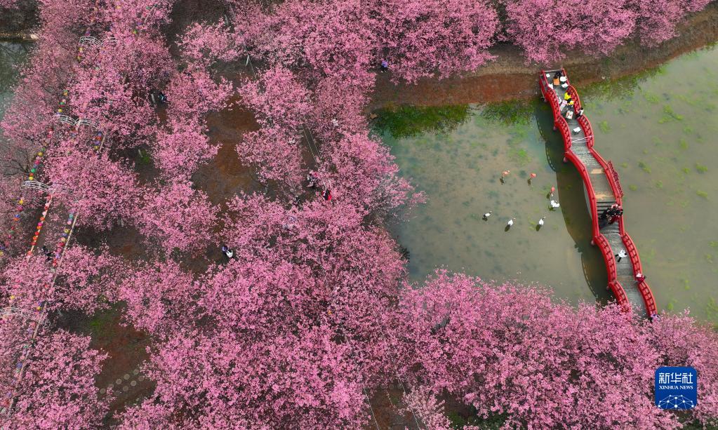 隨著(zhù)氣溫回暖,湖南省常寧市羅橋鎮櫻花園里的3000多畝櫻花次第綻放,春色滿(mǎn)園,吸引游客前來(lái)觀(guān)賞游玩。