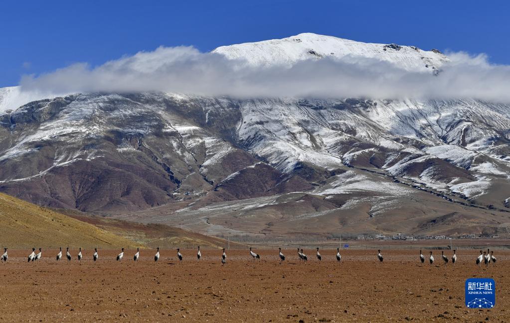 在西藏拉薩市林周縣春堆鄉,黑頸鶴在雪山下的農田里覓食(3月1日攝)。