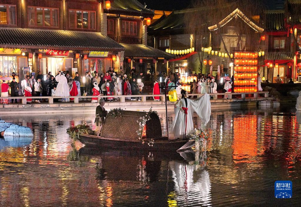 演員在河南省洛陽(yáng)市洛邑古城內為游客表演(2月22日攝)。