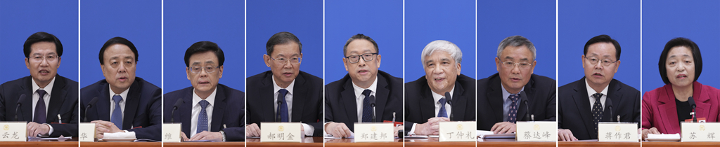 3月5日,全國政協(xié)十四屆一次會(huì )議在北京人民大會(huì )堂舉行民主黨派中央和全國工商聯(lián)領(lǐng)導人記者會(huì )。這是民革中央主席鄭建邦(左五)、民盟中央主席丁仲禮(右四)、民建中央主席郝明金(左四)、民進(jìn)中央主席蔡達峰(右三)、農工黨中央主席何維(左三)、致公黨中央主席蔣作君(右二)、九三學(xué)社中央主席武維華(左二)、臺盟中央主席蘇輝(右一)、全國工商聯(lián)主席高云龍(左一)在記者會(huì )上(拼版照片)。