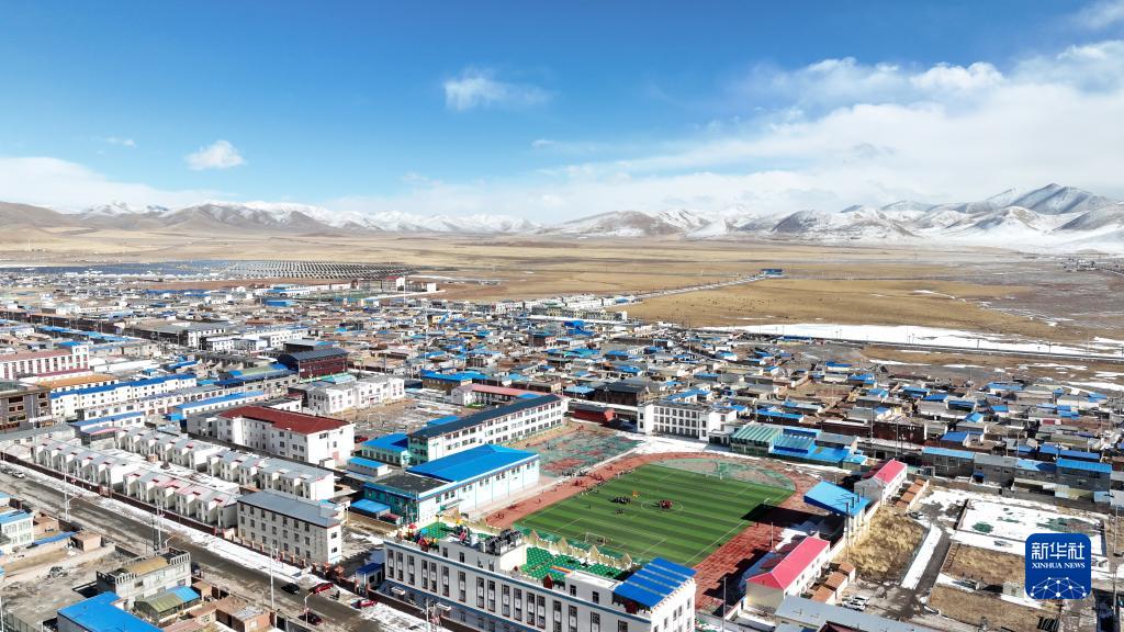 3月1日,在玉樹(shù)州曲麻萊縣,曲麻萊縣第一完全小學(xué)學(xué)生在足球課上(無(wú)人機照片)。