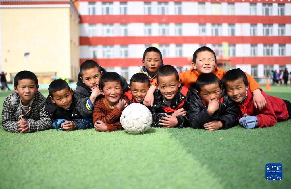 3月1日,在玉樹(shù)州治多縣,吉尕小學(xué)二年級學(xué)生才仁巴?。ㄗ笏模┖托』锇閭冊趯W(xué)校的球場(chǎng)上。
