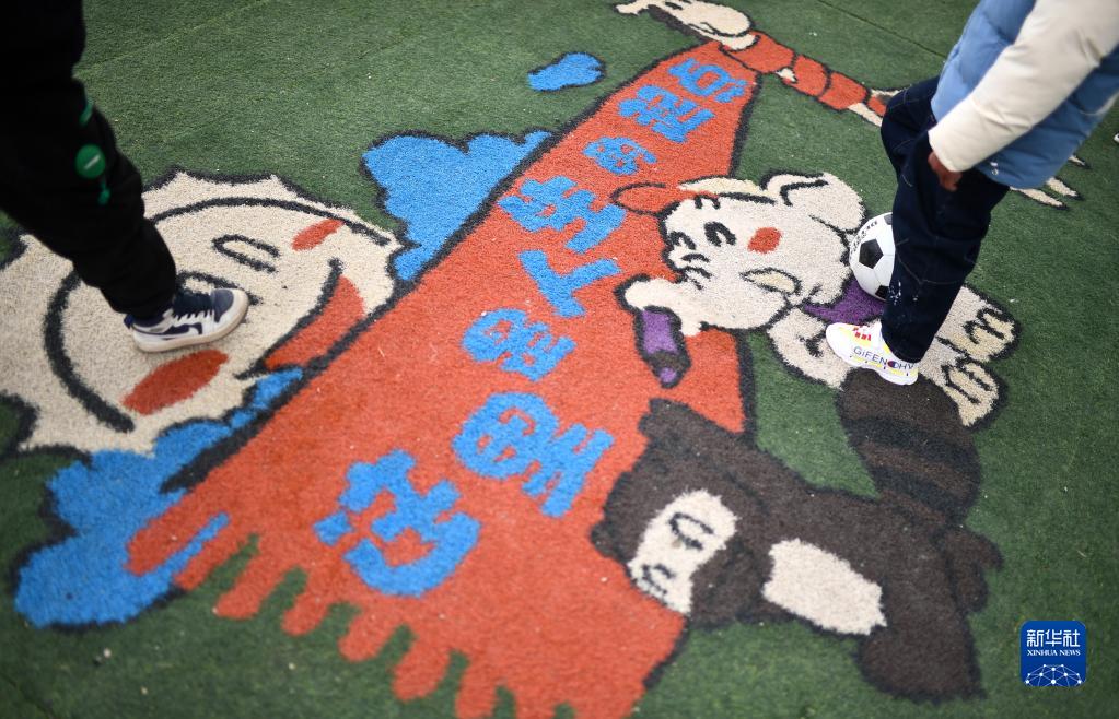 3月1日,在玉樹(shù)州治多縣,城南幼兒園小朋友在幼兒園的球場(chǎng)上。