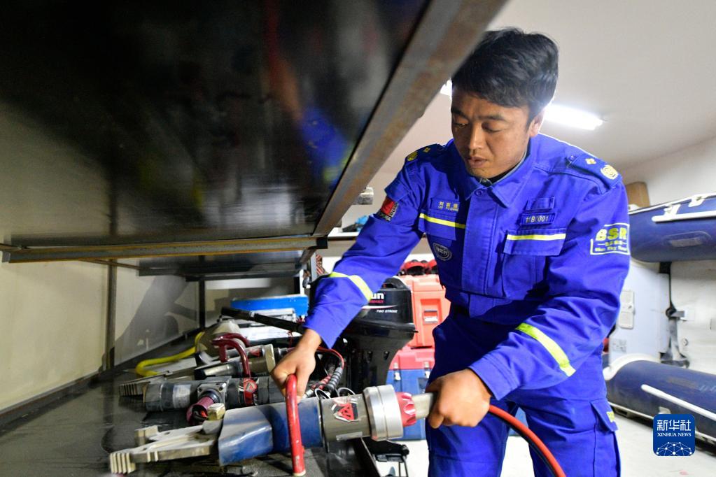 3月4日,劉富強在嘉峪關(guān)藍天救援隊裝備庫整理救援裝備。