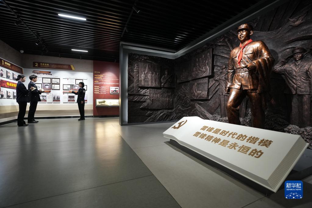 3月4日,“百姓雷鋒”團隊雷鋒派出所的民警在派出所內的展廳交流宣講雷鋒精神的心得。