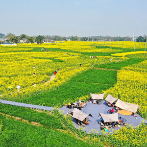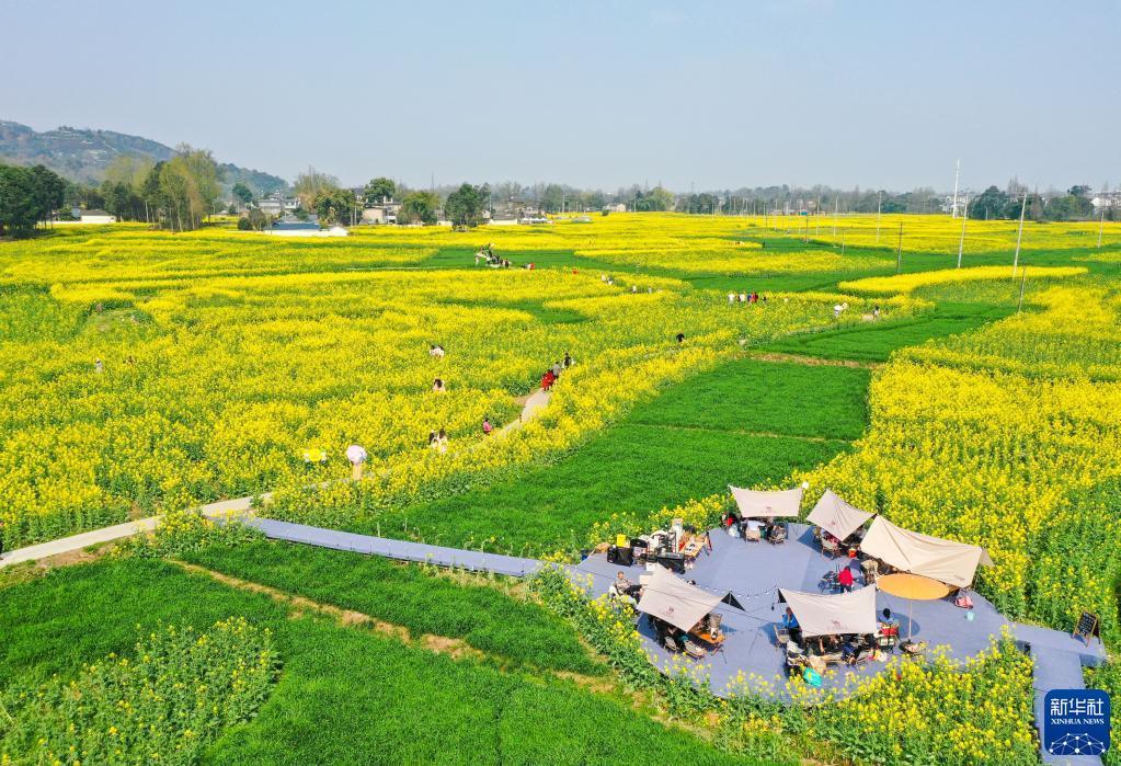 近日,位于四川成都崇州市的數萬(wàn)畝油菜花競相綻放,吸引游客前來(lái)踏春觀(guān)光。