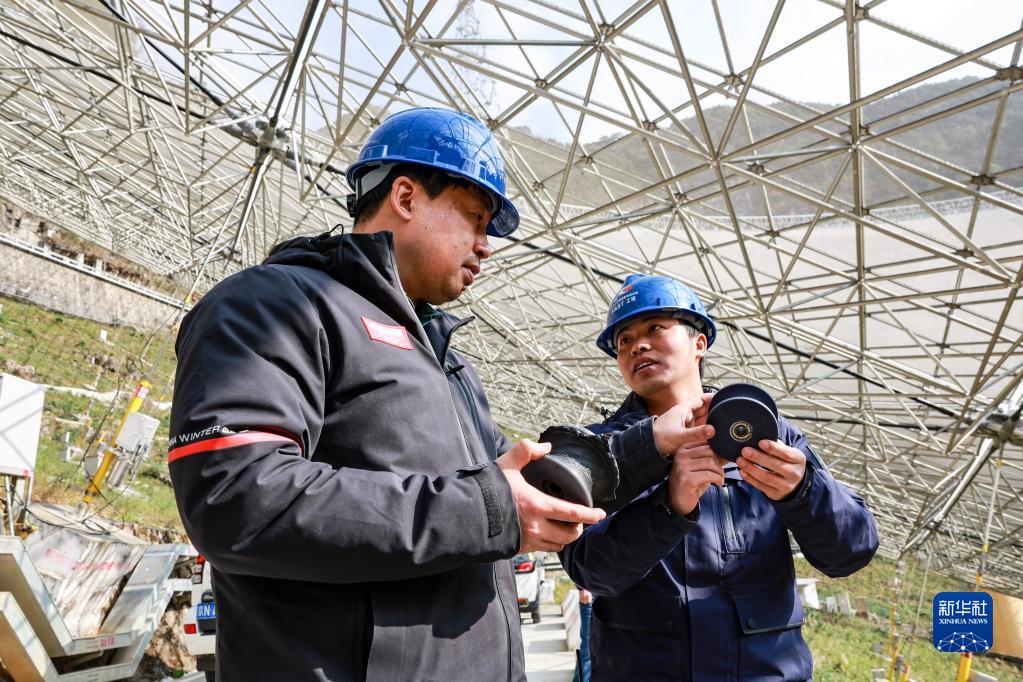 2月13日,姜鵬(左)在“中國天眼”的反射面板下與工作人員交談(維護保養期間拍攝)。