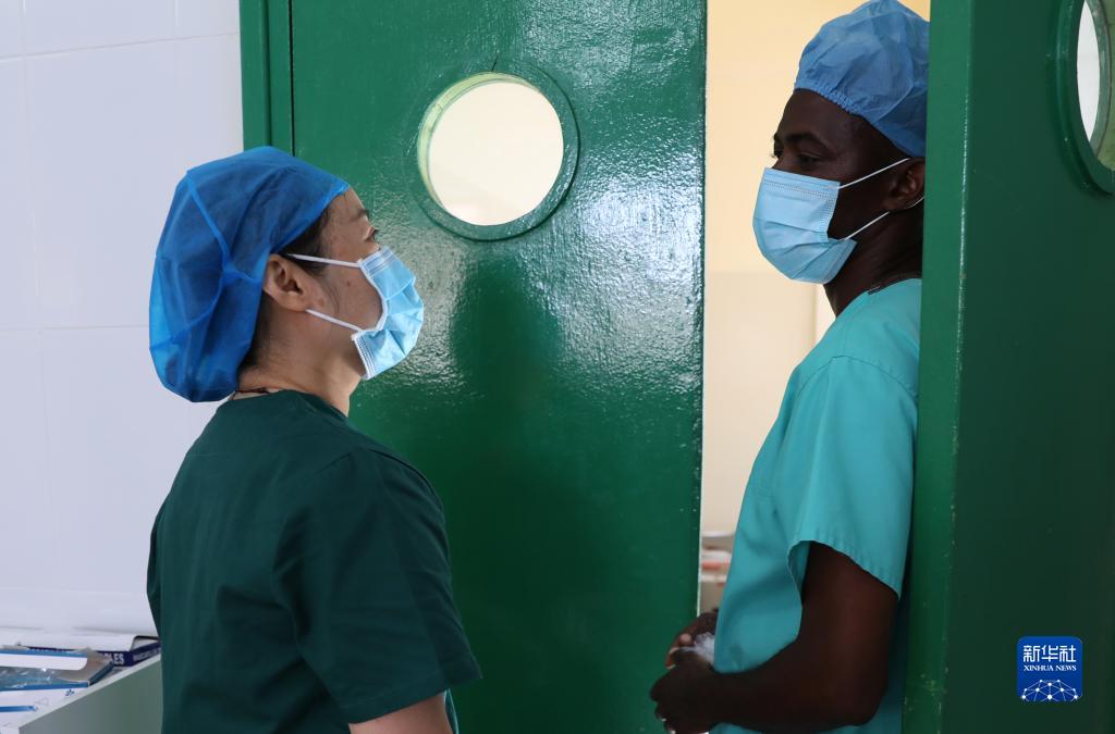 2月23日,在坦桑尼亞桑給巴爾島納茲莫加醫院,董莉莉(左)在術(shù)前與桑給巴爾同事交流。