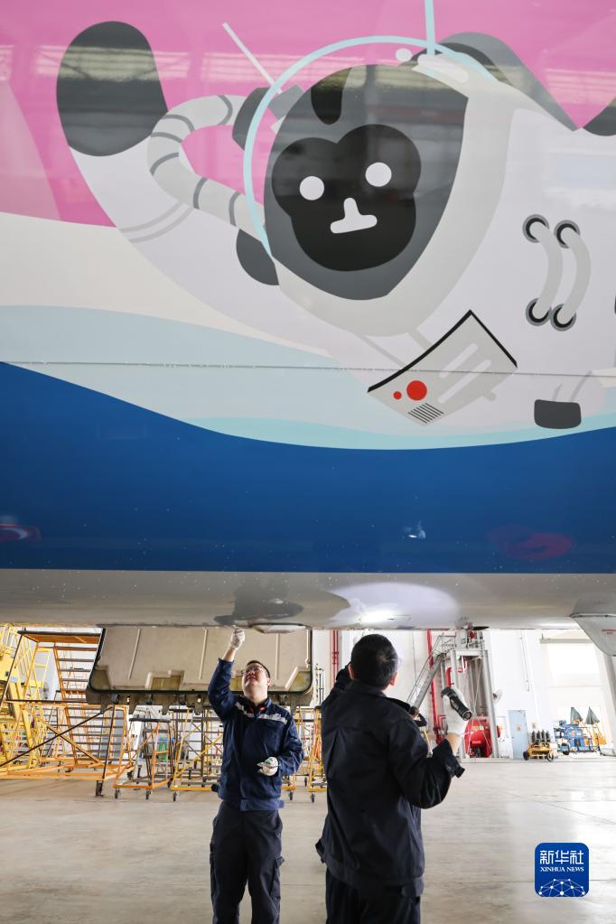 3月7日,在??诿捞m國際機場(chǎng),南航機務(wù)人員對“消博號”彩繪飛機進(jìn)行深度檢查。