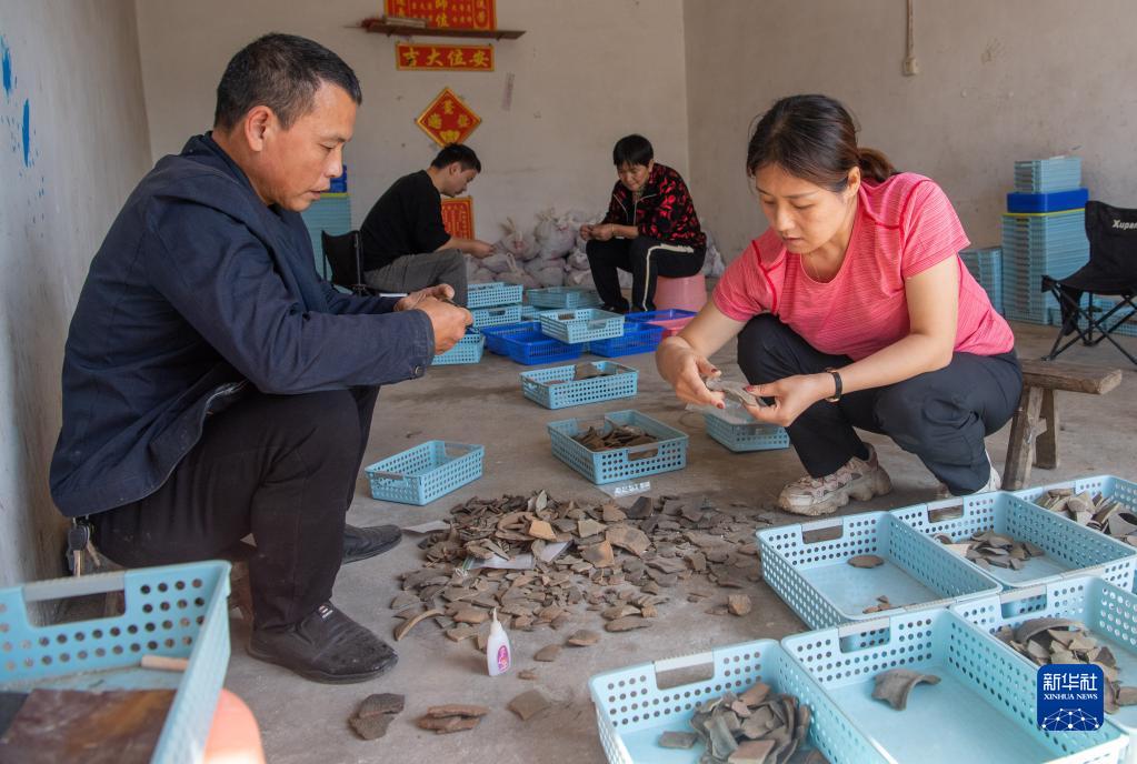 2022年10月19日,在位于重慶市涪陵區的小田溪墓群考古發(fā)掘現場(chǎng)臨時(shí)庫房?jì)?,女子考古隊隊長(cháng)燕妮(右一)在對出土陶片進(jìn)行清點(diǎn)和拼對。