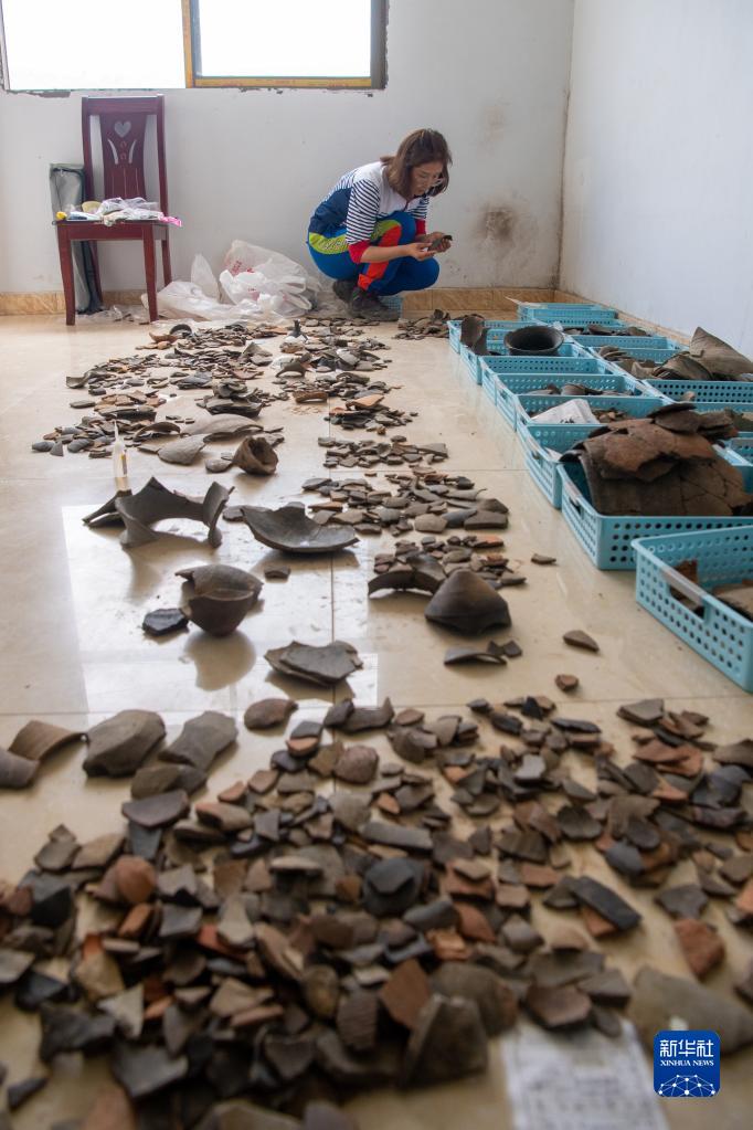 2022年5月24日,在位于重慶市涪陵區的小田溪墓群考古發(fā)掘現場(chǎng)臨時(shí)庫房?jì)?,燕妮在對出土陶片進(jìn)行清點(diǎn)和拼對。