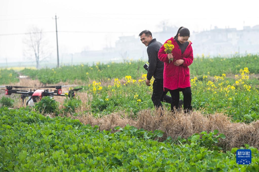 3月1日,女飛手吳玲(右)與丈夫走在油菜田間,準備進(jìn)行噴藥作業(yè)。