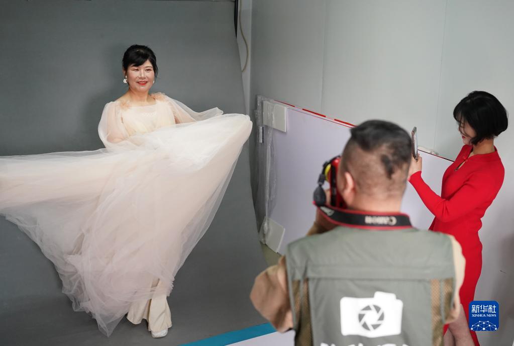 3月7日,在西安航天智能裝備產(chǎn)業(yè)基地建設項目現場(chǎng)一間辦公室內,攝影師在為女建筑工人拍照。