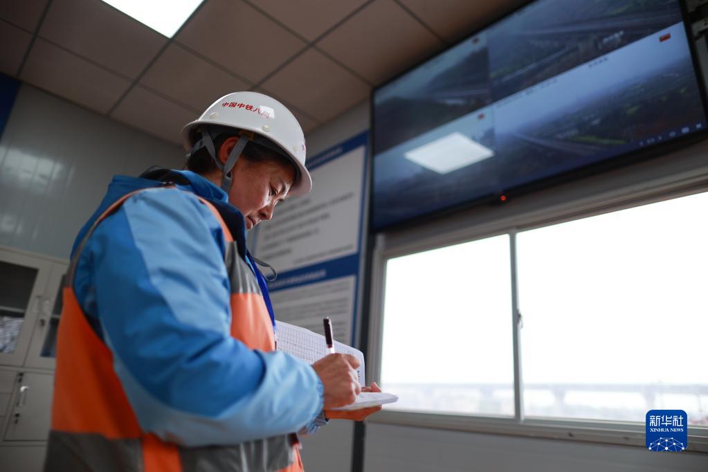 3月7日,中鐵八局女職工朱桂英在記錄列車(chē)經(jīng)過(guò)時(shí)間。