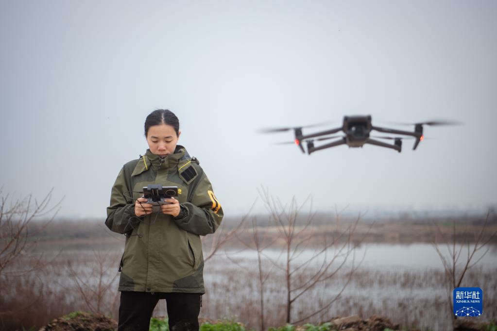 3月7日,譚文卓使用無(wú)人機拍攝記錄沉湖濕地苔草生長(cháng)情況。