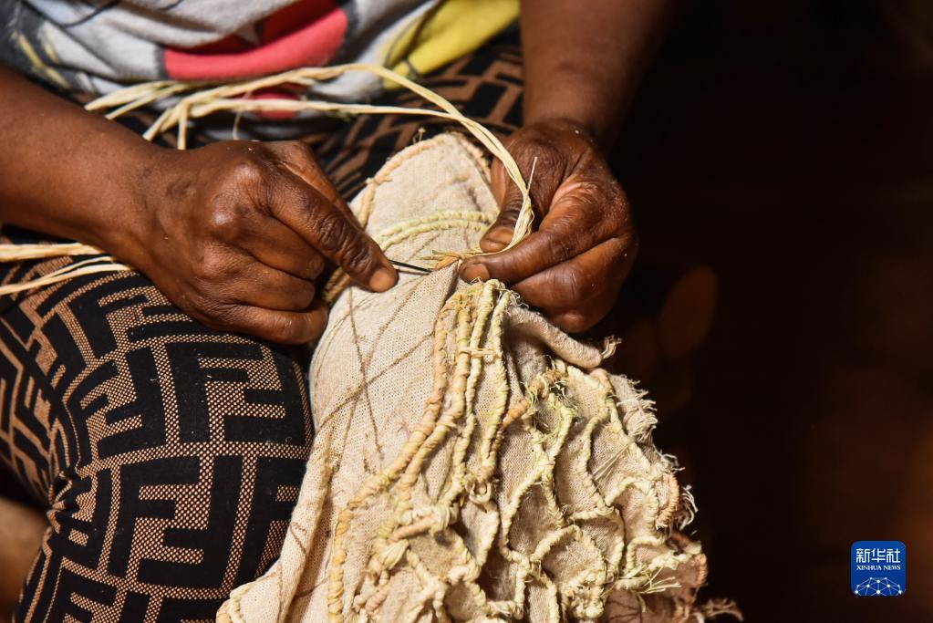 3月3日,在喀麥隆西部大區巴哈姆,弗洛爾用棕櫚葉脈做線(xiàn)把紋樣扎起來(lái)。