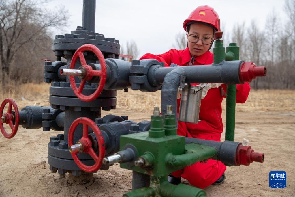 3月7日,在大慶油田第四采油廠(chǎng)第一作業(yè)區,北六隊采油工王瑀琦在抽油機井井口抽取油樣。
