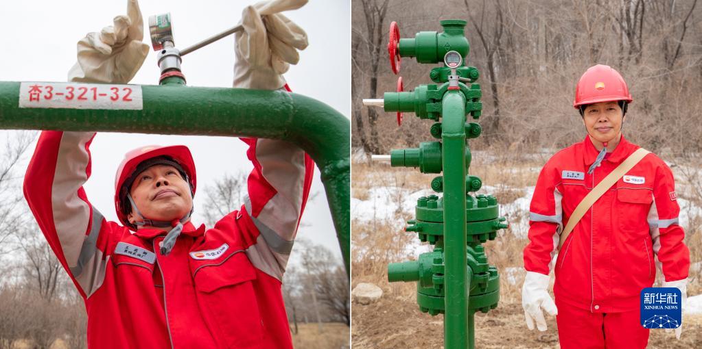 拼版照片:左圖為大慶油田第四采油廠(chǎng)第一作業(yè)區北六隊采油工王莉娜在測取水井油壓;右圖為王莉娜在崗位上留影(3月7日攝)。