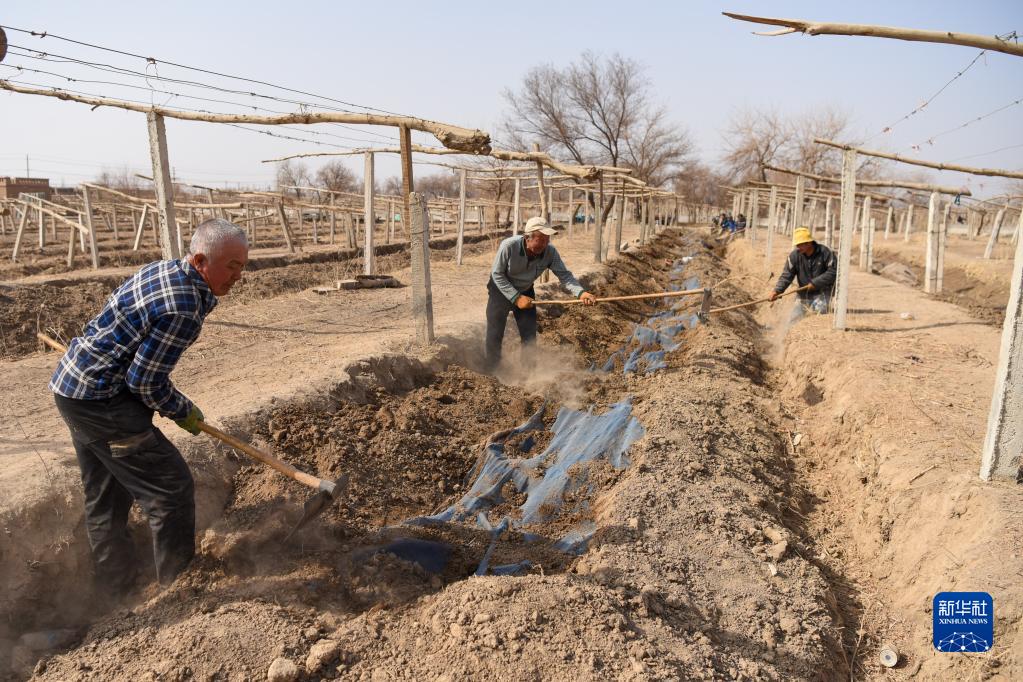3月8日,在吐魯番市高昌區葡萄鎮,農民將葡萄藤從地下挖出。