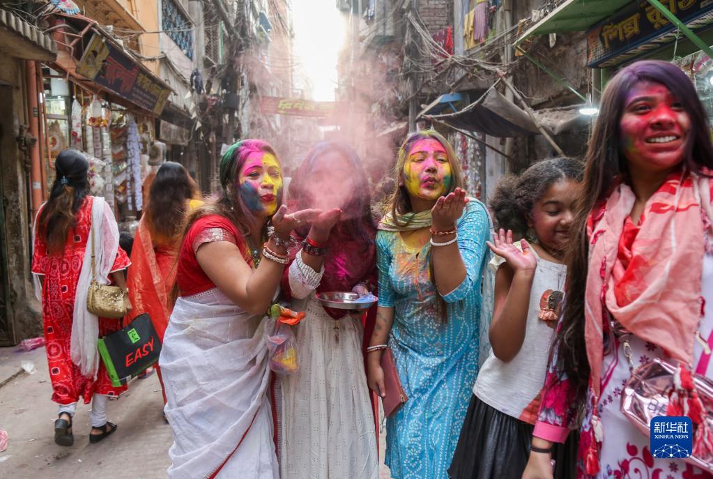 3月7日,人們在孟加拉國達卡參加灑紅節慶?;顒?dòng)。