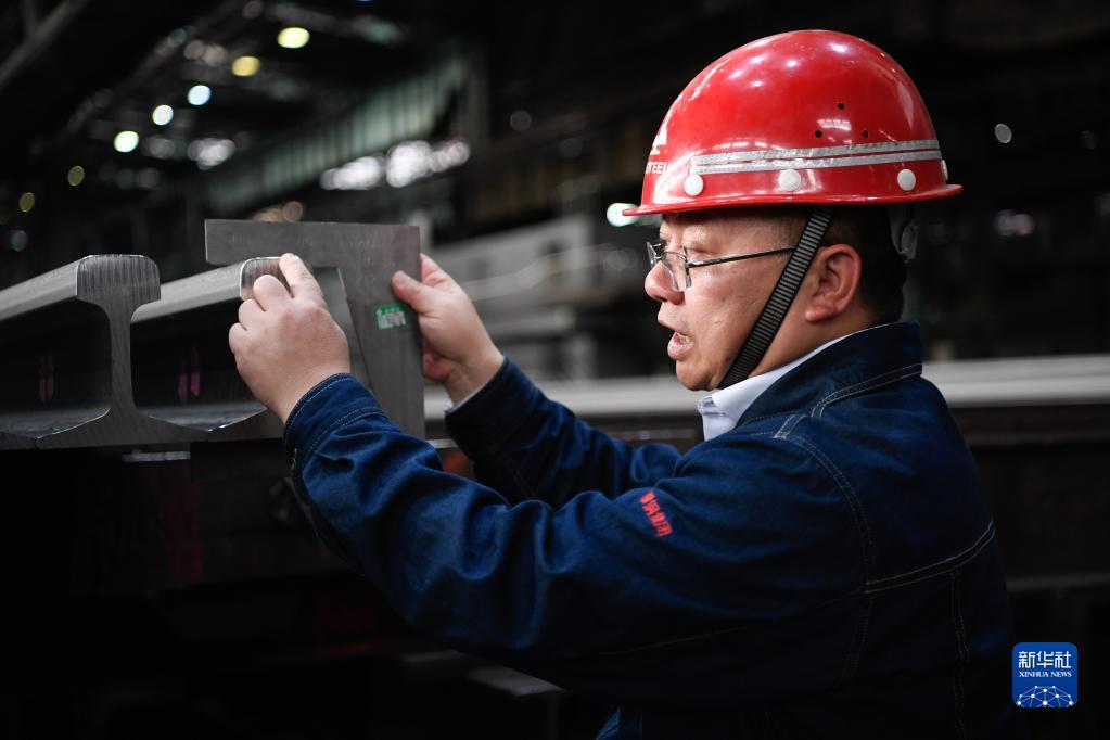鄒明在鞍鋼集團攀鋼攀枝花鋼釩有限公司軌梁廠(chǎng)檢查成型鋼軌表面情況(2月21日攝)。