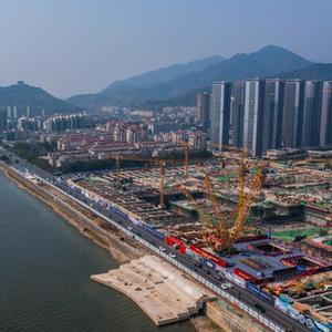 空中俯瞰富春江畔秦望通道工程過(guò)江隧道江北工作井施工現場(chǎng)(3月9日攝,無(wú)人機照片)。