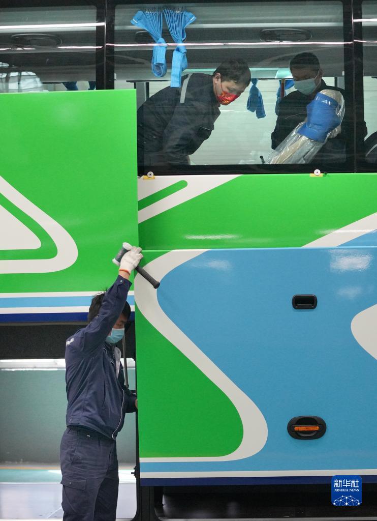 3月8日,工作人員在宇通新能源廠(chǎng)區高端及海外承裝車(chē)間調試車(chē)輛行李艙門(mén)。