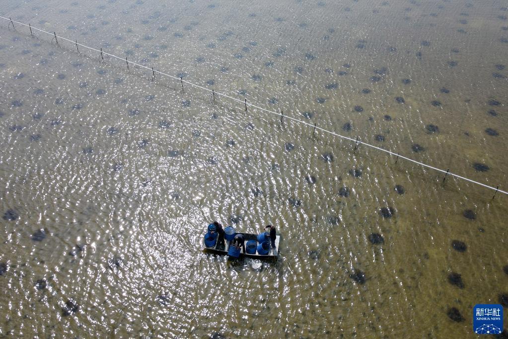 3月9日,在安徽省蚌埠市五河縣小圩鎮,蟹農在投放蟹苗(無(wú)人機照片)。