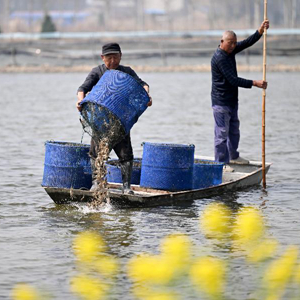 近日,安徽省蚌埠市五河縣螃蟹養殖戶(hù)搶抓晴好天氣投放蟹苗,蟹塘上一片忙碌景象。