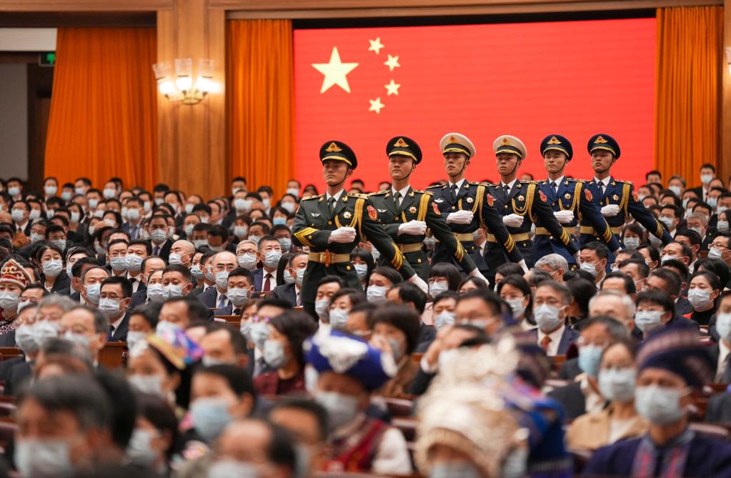 3月10日,中華人民共和國第十四屆全國人民代表大會(huì )第一次會(huì )議憲法宣誓儀式在北京人民大會(huì )堂舉行。這是陸??杖妰x仗兵正步行進(jìn)。