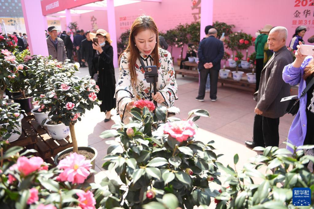 3月10日,一名主播在金華市人民廣場(chǎng)的茶花展上直播介紹茶花。