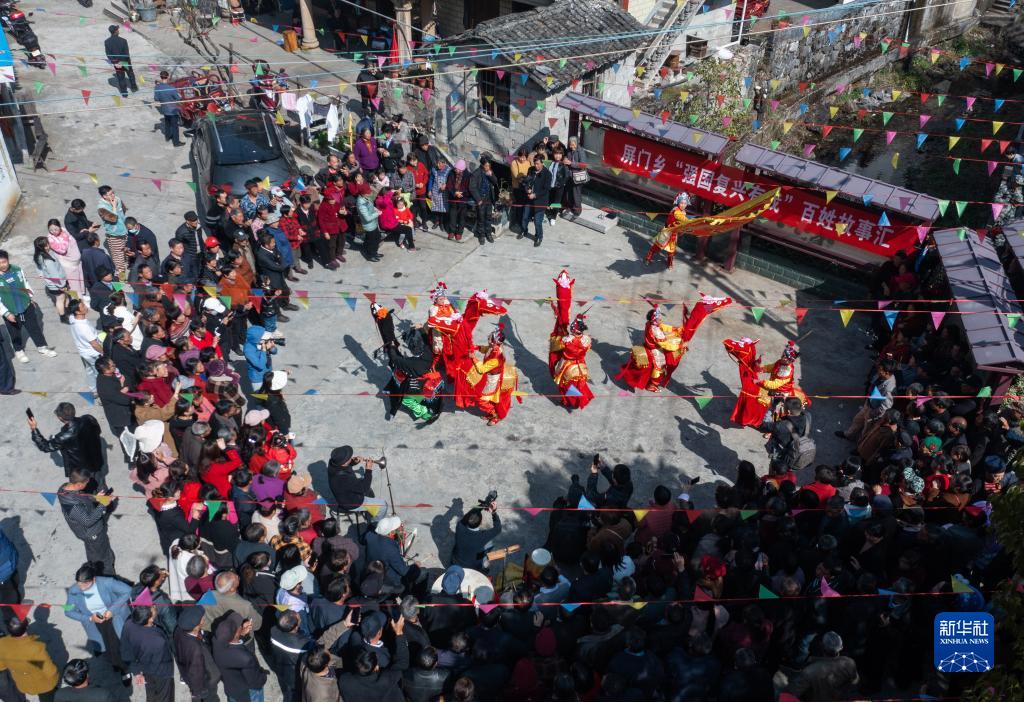 3月10日,在浙江省杭州市淳安縣屏門(mén)鄉屏前村的傳統廟會(huì )上,人們在觀(guān)看竹馬表演(無(wú)人機照片)。