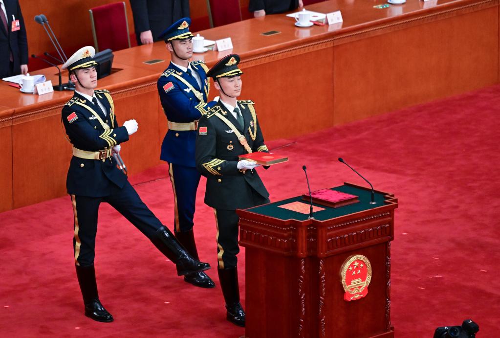 3月10日,十四屆全國人大一次會(huì )議在北京人民大會(huì )堂舉行第三次全體會(huì )議。全體會(huì )議各項議程進(jìn)行完畢后,舉行中華人民共和國第十四屆全國人民代表大會(huì )第一次會(huì )議憲法宣誓儀式。這是禮兵護送《中華人民共和國憲法》入場(chǎng)。
