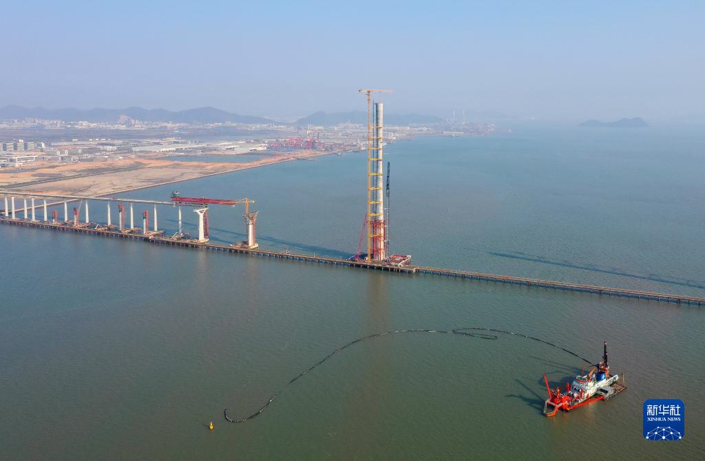 中交路建承建的黃茅??绾Mǖ栏邫诟鄞髽驏|主塔已經(jīng)封頂(無(wú)人機照片,3月10日攝)。
