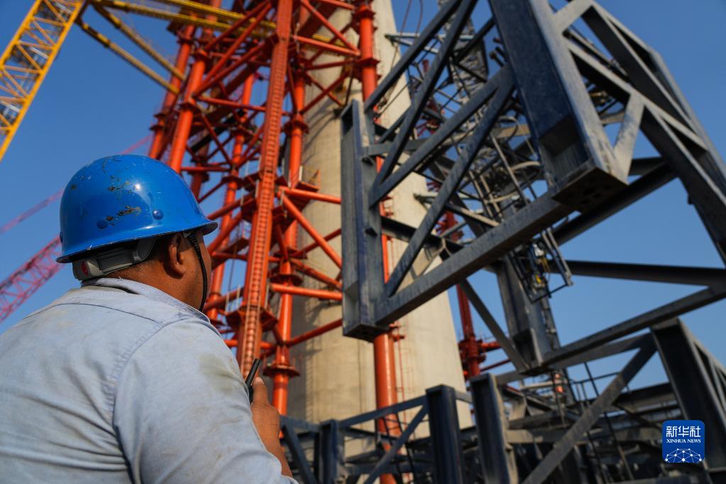 中交路建施工人員在黃茅??绾Mǖ栏邫诟鄞髽驏|主塔進(jìn)行塔吊拆卸作業(yè)(3月10日攝)。