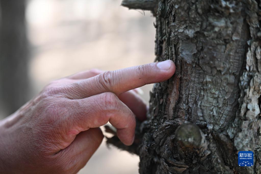 3月10日,在五河縣朱頂鎮陸沖山的山林中,張偉在檢查樹(shù)木的病蟲(chóng)害情況。
