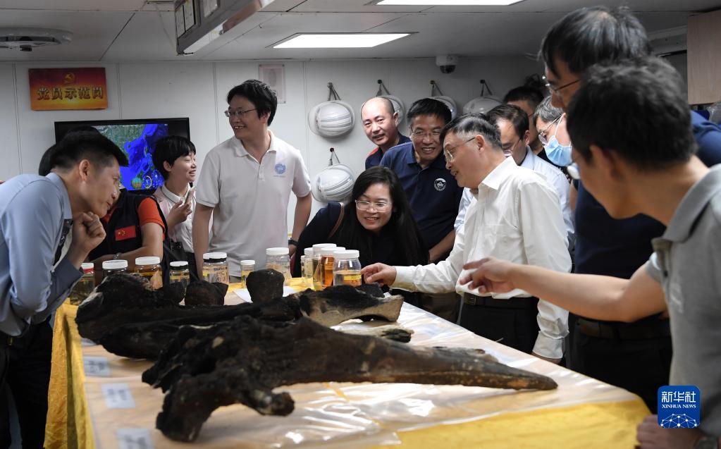 3月11日,“探索一號”科考船攜“奮斗者”號全海深載人潛水器抵達三亞,科研人員在介紹采集的深淵宏生物、巖石、結核、沉積物樣品。