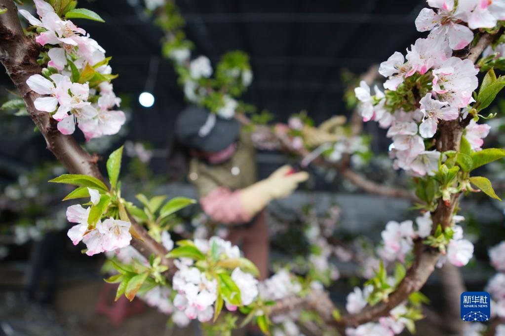 3月9日,在黑龍江省佳木斯市郊區現代農業(yè)產(chǎn)業(yè)園區棚室內,工作人員在給櫻桃樹(shù)人工授粉。