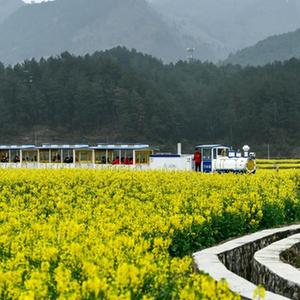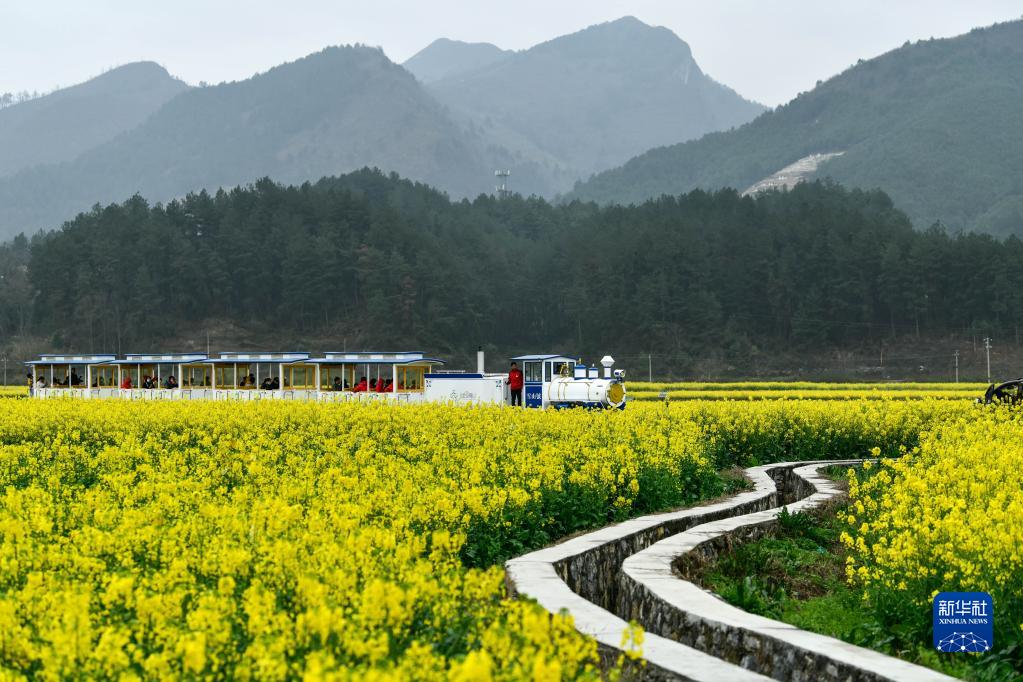 3月12日,在貴州省貴定縣盤(pán)江鎮“金海雪山”景區,游客乘坐觀(guān)光小火車(chē)觀(guān)賞油菜花。