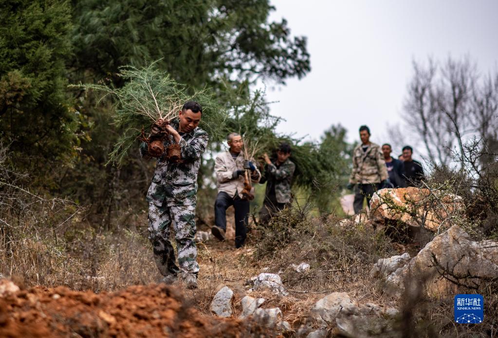 3月12日,陸良縣龍海鄉林業(yè)站站長(cháng)徐見(jiàn)林(前)背著(zhù)樹(shù)苗帶領(lǐng)當地干部群眾在花木山林場(chǎng)植樹(shù)。