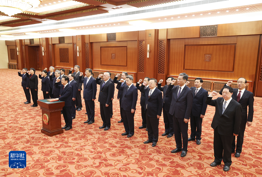 3月12日,十四屆全國人大一次會(huì )議在北京人民大會(huì )堂舉行第五次全體會(huì )議。根據國務(wù)院總理李強的提名,經(jīng)投票表決,決定國務(wù)院各部部長(cháng)、各委員會(huì )主任、中國人民銀行行長(cháng)、審計長(cháng)。這是國務(wù)院各部部長(cháng)、各委員會(huì )主任、中國人民銀行行長(cháng)、審計長(cháng)進(jìn)行憲法宣誓。